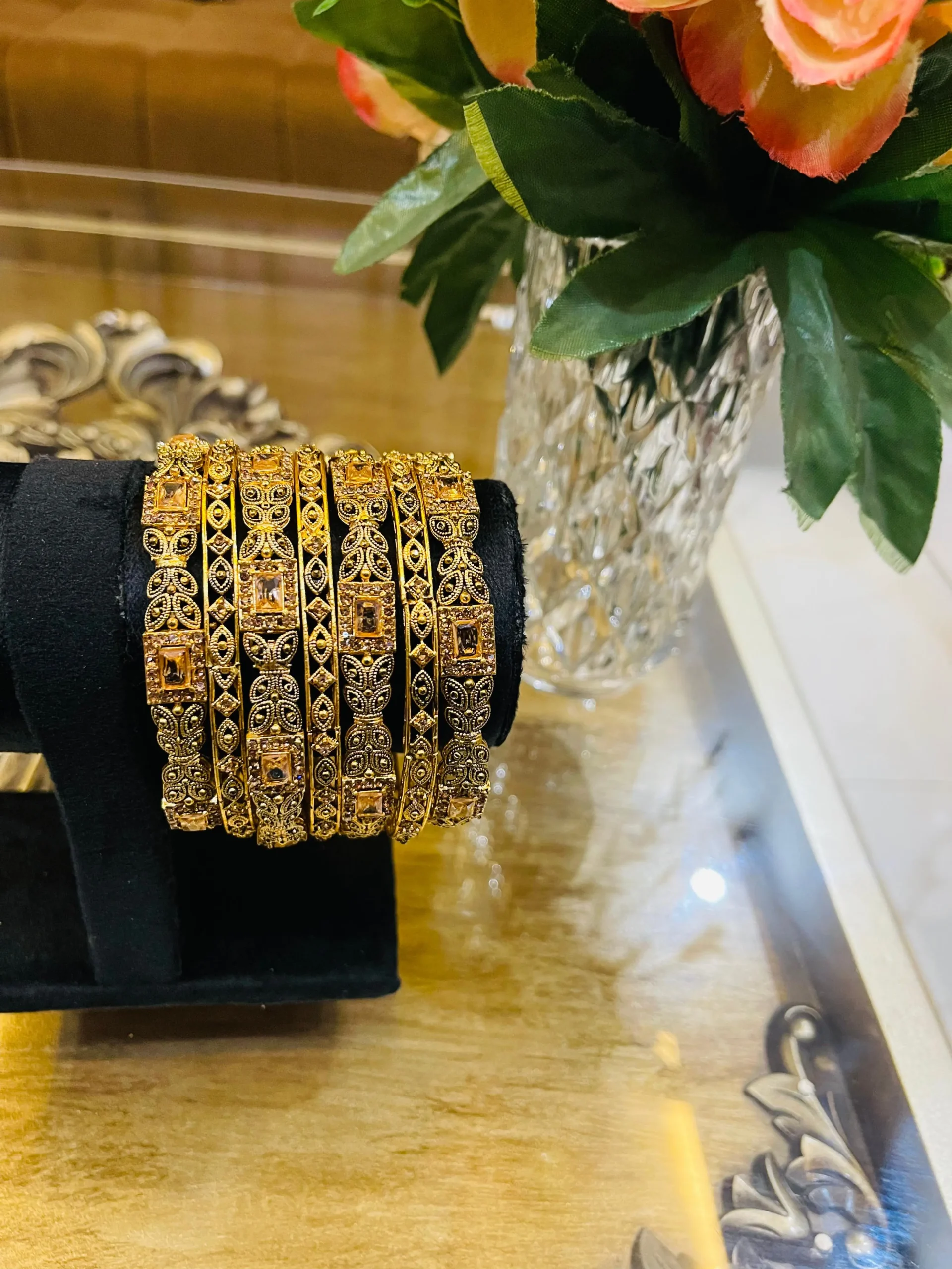 This stunning bangle set features an exquisite antique gold finish, beautifully crafted with intricate filigree patterns and delicate geometric detailing. Each bangle is adorned with elegant rectangular stone accents that add a subtle sparkle while maintaining a rich, traditional charm. The fine craftsmanship reflects timeless artistry, making this set perfect for weddings, festive occasions, or elevating any ethnic look. Designed to be worn together or styled individually, these bangles bring a graceful blend of heritage and luxury to your jewelry collection. 💛