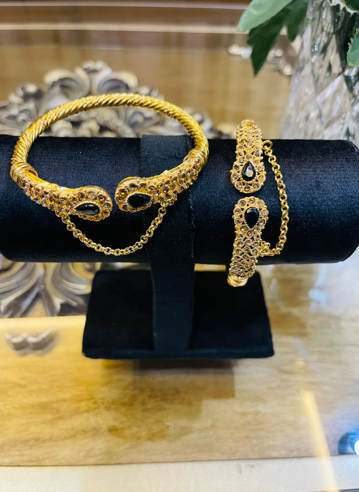 This elegant bangle set showcases a luxurious antique gold finish paired with striking black teardrop stone accents. Designed with a graceful open-cuff style and detailed stone-studded ends, the bangles are further enhanced with delicate safety chains for a secure and stylish fit. The twisted gold band adds a classic touch, while the bold black stones bring a modern royal charm. Perfect for festive wear, weddings, or evening occasions, this set beautifully blends tradition with contemporary elegance. 🖤💛