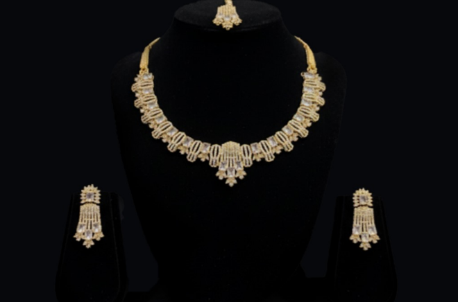 This exquisite jewelry set exudes luxury and grace, featuring a dazzling gold-plated necklace, matching earrings, and a delicate maang tikka. Adorned with shimmering crystal stones and intricate detailing, each piece captures the perfect balance of tradition and modern elegance. The square-cut stones and fine craftsmanship add a royal charm, making it an ideal choice for weddings, festive events, and special occasions. Elevate your look with this timeless set that embodies sophistication and brilliance.