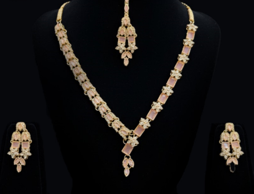This exquisite pink jewellery set embodies elegance and charm with its soft pastel tones and dazzling gold detailing. The set features a delicately crafted necklace paired with matching earrings, adorned with shimmering pink stones and sparkling white crystals. Its floral-inspired design adds a feminine and refined touch, making it perfect for weddings, parties, or festive celebrations. Radiate sophistication and grace with this stunning pink jewellery set that complements both traditional and modern outfits.